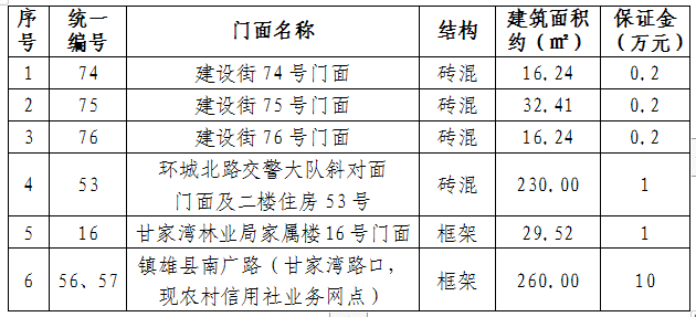 1、拍租6個(gè)門面3年期使用權(quán),詳見(jiàn)下表: